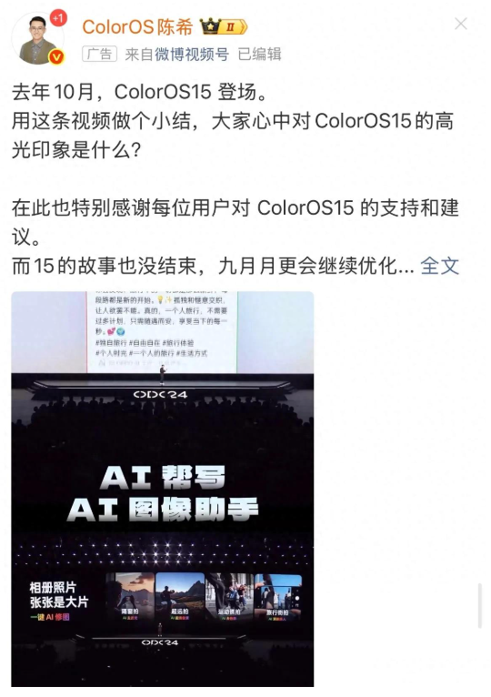 olorOS设计总监发布微博称,去年10月登场的ColorOS15已收获众多用户反馈,并用视频小结征集大家心中的“高光印象”。他在感谢用户支持的同时特别强调:“15的故事也没结束,九月月更会继续优化上新”。