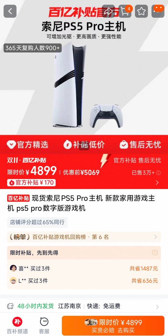 淘宝官方百亿补贴现已上架国行PS5 Pro,价格4899元。无需成为88VIP,也不用领取优惠券,所有用户均可直接下单购买,操作简便。