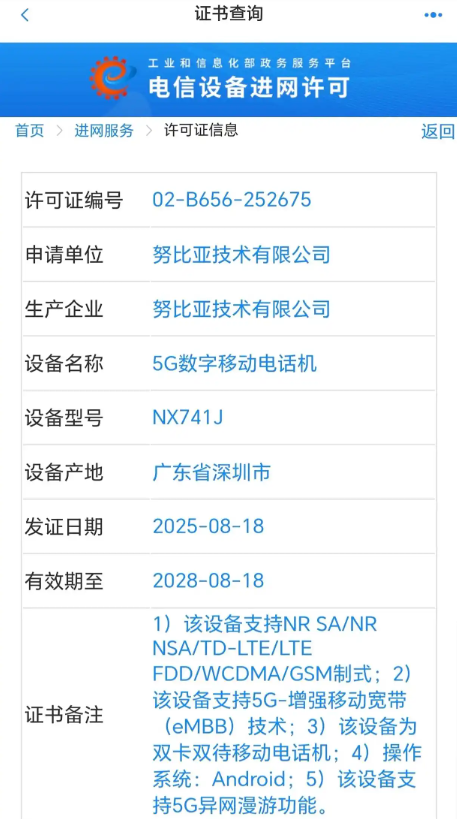 日前,一款型号为“NX741J”努比亚新机在工信部入网,相关页面显示该设备支持NRSA/NRNSA/TD-LTE/LTEFDD/WCDMA/GSM制式、支持5G-增强移动宽带(eMBB)技术、支持5G异网漫游功能等。