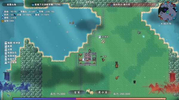 地图中的都城、县城能够进行补给,但是想要补给需要一定的威名,想要提高威名等级,就需要在地图中击败敌对势力的名将(有名有姓的部队),如下图中的张曼成。