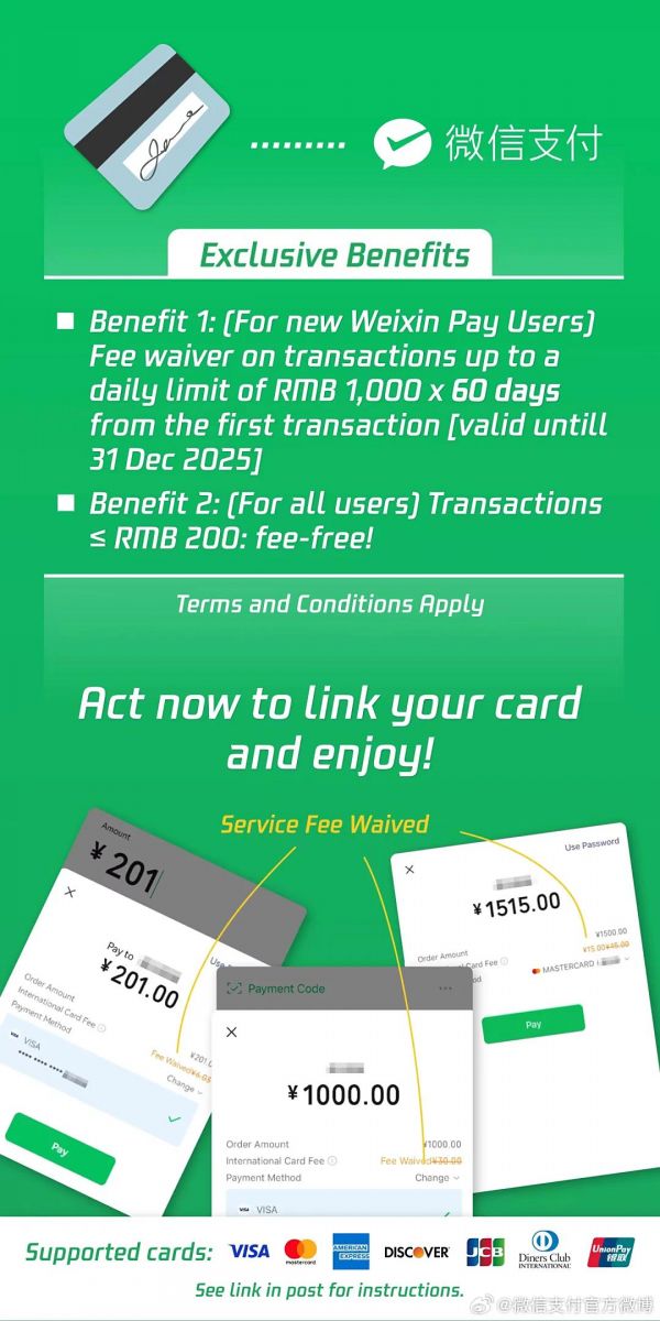 对于暂未覆盖上述电子钱包地区的用户,也可通过微信支付绑定 Visa、Mastercard 等国际银行卡,在国内同样也能支付。