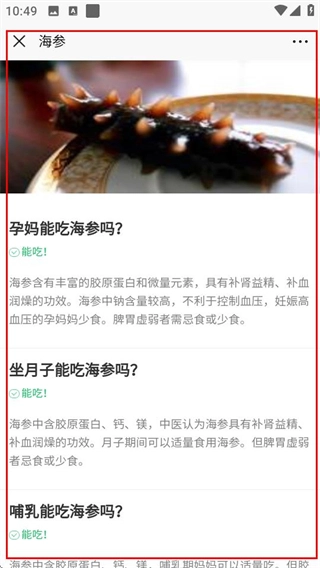在海产品列表页面,挑选想要查看的食物(例如海参),然后进入该食物的详情页面。