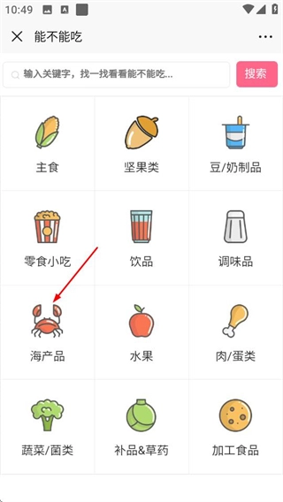 在母子健康手册页面,点击“能不能吃”选项,即可进入食物分类页面。