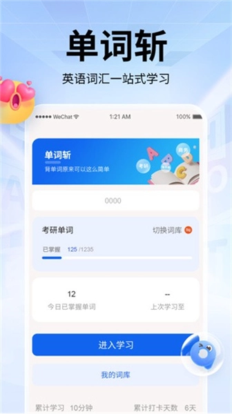 单词斩背单词是一款用于在线学习英语背单词的办公学习类软件。用户借助这款软件,能够不受时间和地点的限制进行背单词学习,其背单词界面配备了单词对应的发音和例句,助力用户更高效地记忆单词。软件多种学习模块,涵盖进入学习、测试按钮以及我的词库等功能板块,用户可根据自身需求自由选择学习内容。另外,用户在软件中完成单词学习后,还能通过自主测试来巩固所学单词的记忆,并查看自己对单词的掌握程度。