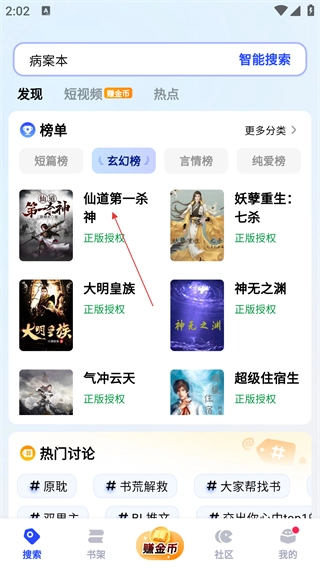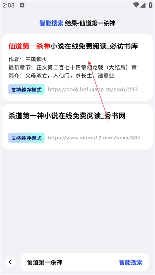 在应用主页面的榜单里找到并选择【玄幻榜】,接着点击你想查看的目标小说(比如【仙道第一杀神】),这样就能进入智能搜索结果页面了。
