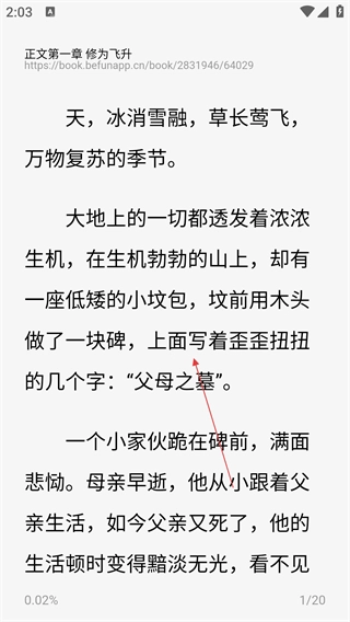 在小说阅读页面,能够开启小说内容的阅读(例如《仙道第一杀神》的第一章内容)。