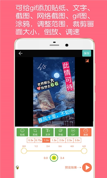 可以对gif进行多种编辑操作,包括添加贴纸、文字、截图、网络截图、gif图以及涂鸦;还能调整画面范围、裁剪画面尺寸,并且支持倒放和调速功能。
