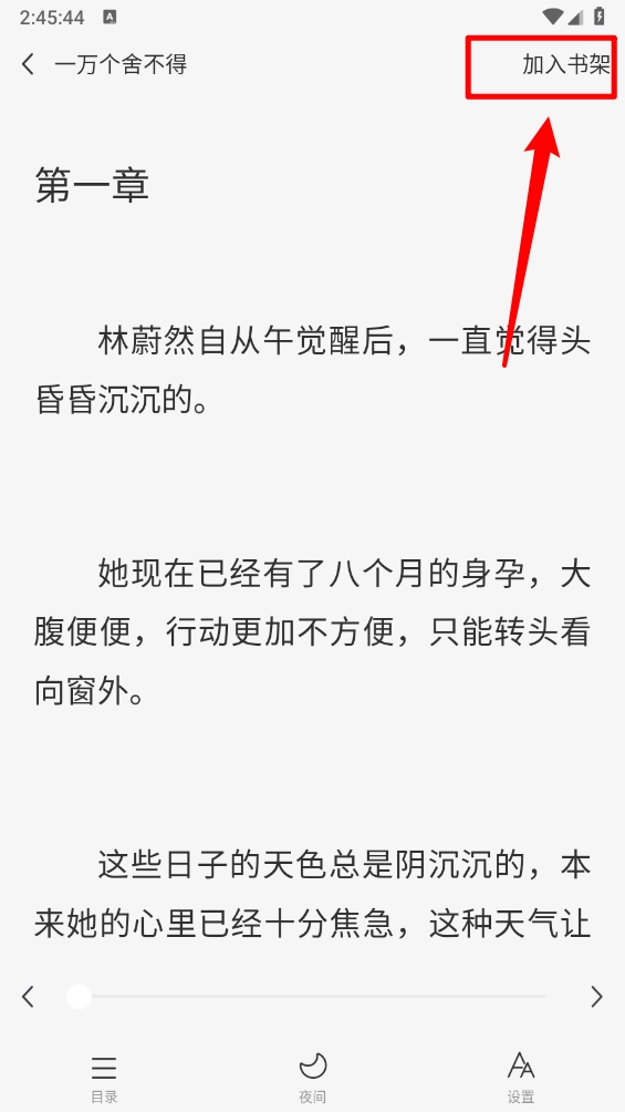在小说阅读界面点击右上角"加入书架"。
