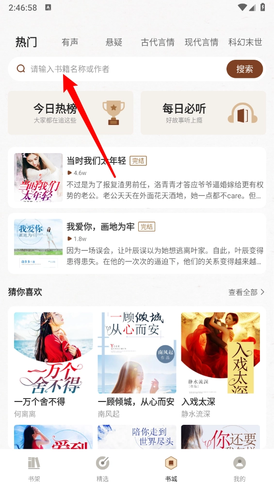 打开度听小说,在书城点击上方的搜索框。