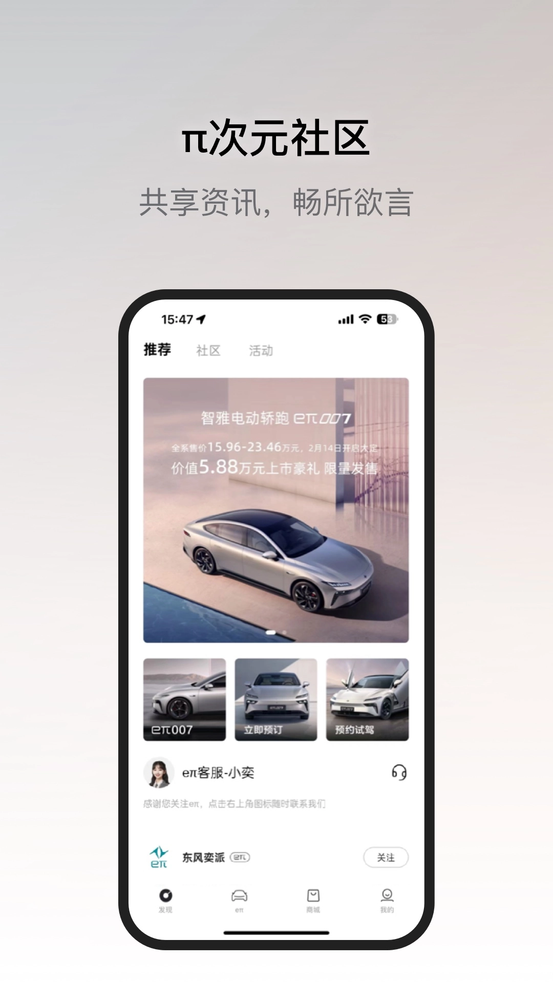 你可以在这里使用车辆控制、充电、在线服务等常用功能,还能在社区和其他车主互动交流,结识更多eπ好友。