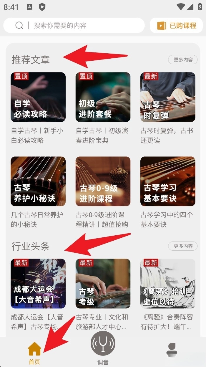 首页向下滑动就能浏览推荐文章和行业头条,点击任意一张卡片就能进入详情页,阅读更多关于古琴学习的资讯。