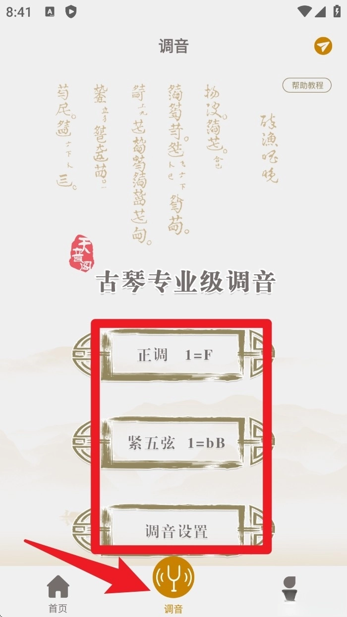 点击底部的“调音”按钮,即可进入古琴的专业调音界面,在该界面中,您可以选择正调、紧五弦等不同的调音模式来进行调音操作。