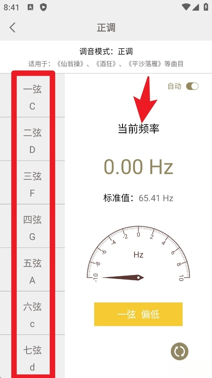 进入调音模式后,找到对应的琴弦,查看其实时频率,再依据指针的提示,把弦音调整到标准数值即可。