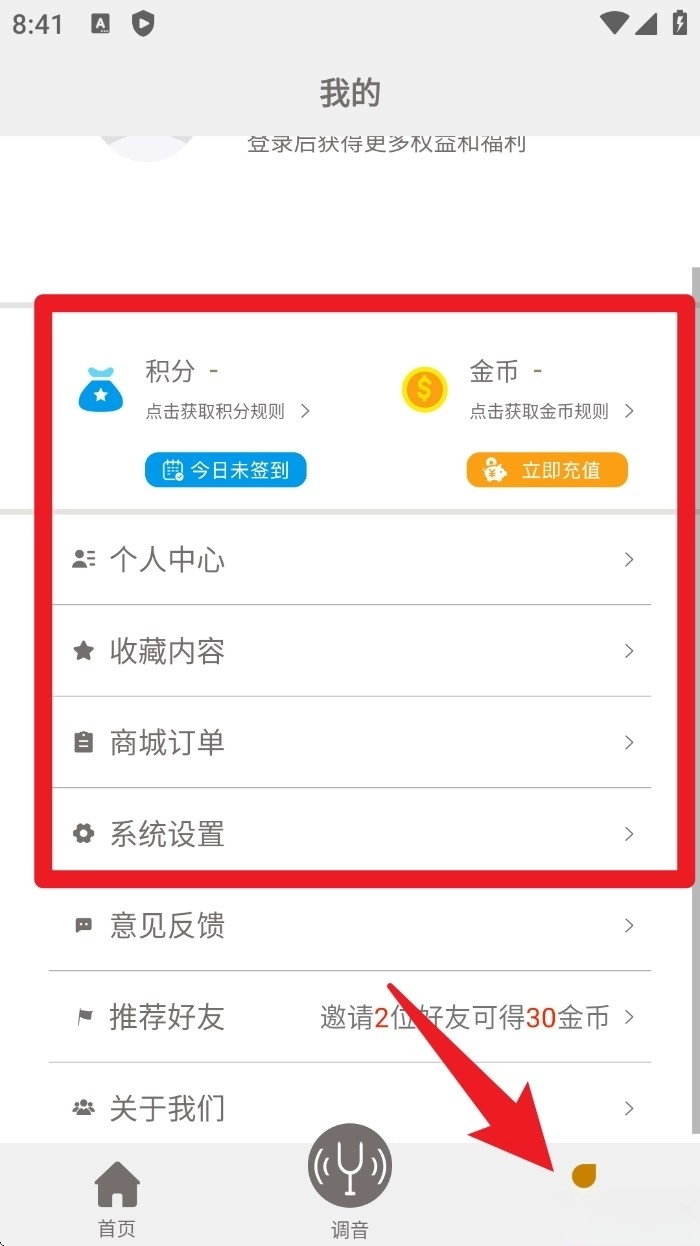 点击底部的“我的”按钮,就能进入个人中心页面,在这里可以查看积分金币、订单记录、收藏内容,还能使用系统设置等功能。