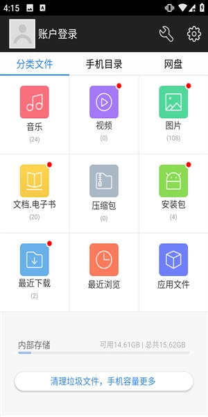 快速扫描手机文件,按图片、音乐、视频、文档、安装包、压缩包等类型进行整理分类,新增文件会有红点标识,清晰醒目,便于查看。