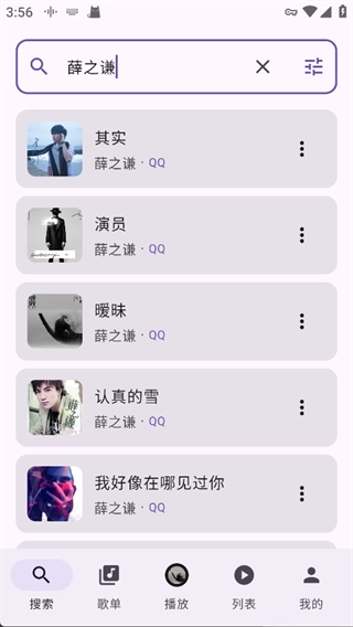 比如,在选择【薛之谦】之后,TuneFreeNext音乐应用会依据选定的QQ音乐音源,呈现出《其实》《演员》这类相匹配的歌曲,点击就能进行播放。