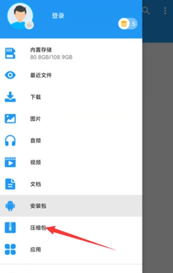 点击左上角的三条横线图标,打开侧边栏,然后在侧边栏的选项里找到并选择压缩包。