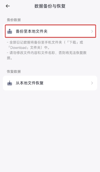 你只需点击“备份至本地文件夹”,等备份完成就行啦,所有日记数据都会被备份到手机文件夹(或者Download文件夹)里。