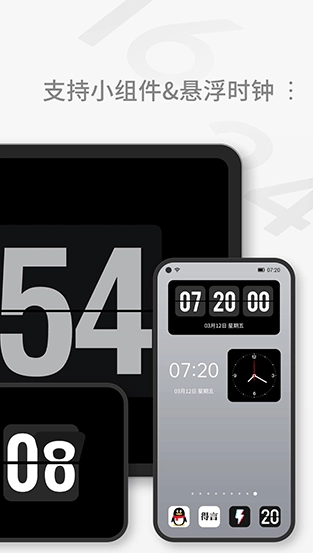 全屏翻页时钟及桌面组件:具备经典翻页动画效果,支持横竖屏自由切换,既能充当屏保使用,也可作为桌面悬浮小组件,便于用户随时查看时间。