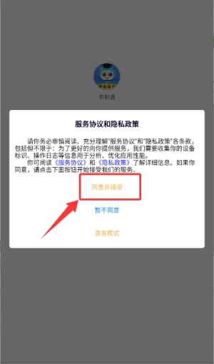 打开应用后,请仔细阅读服务协议和隐私政策,点击“同意并接受”按钮即可进入登录界面。