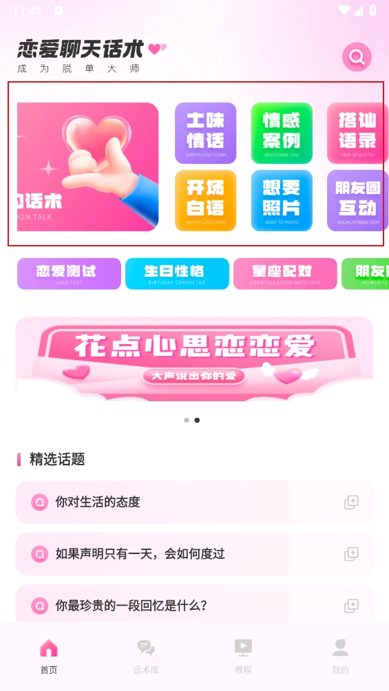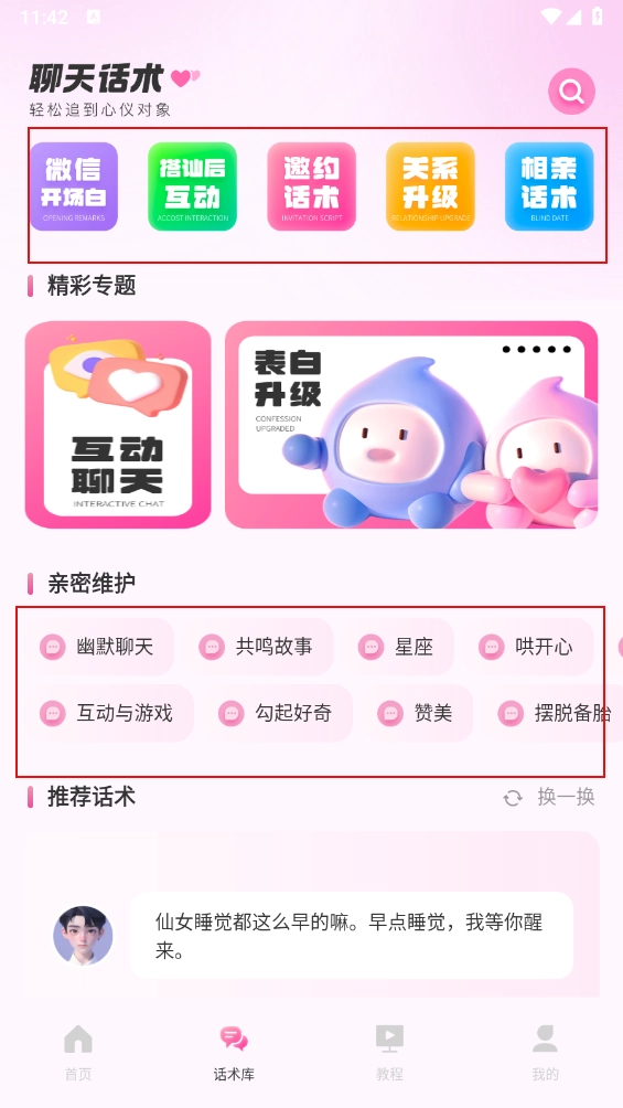 进入软件后,里面包含多个恋爱技巧板块,只需一键点击就能直接使用。