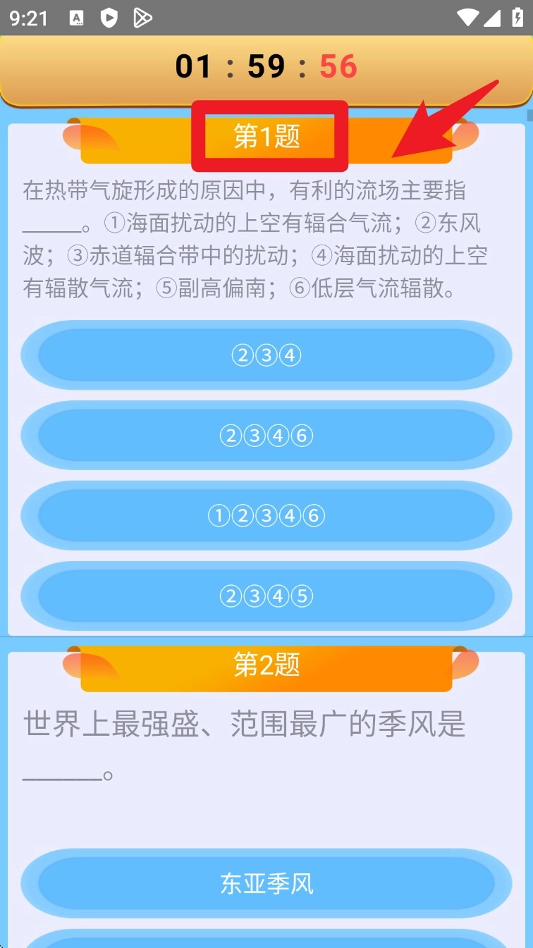 答题过程中题目编号醒目呈现,选项分布清晰明了,用户能够逐题选择答案,同时还能实时查看倒计时。