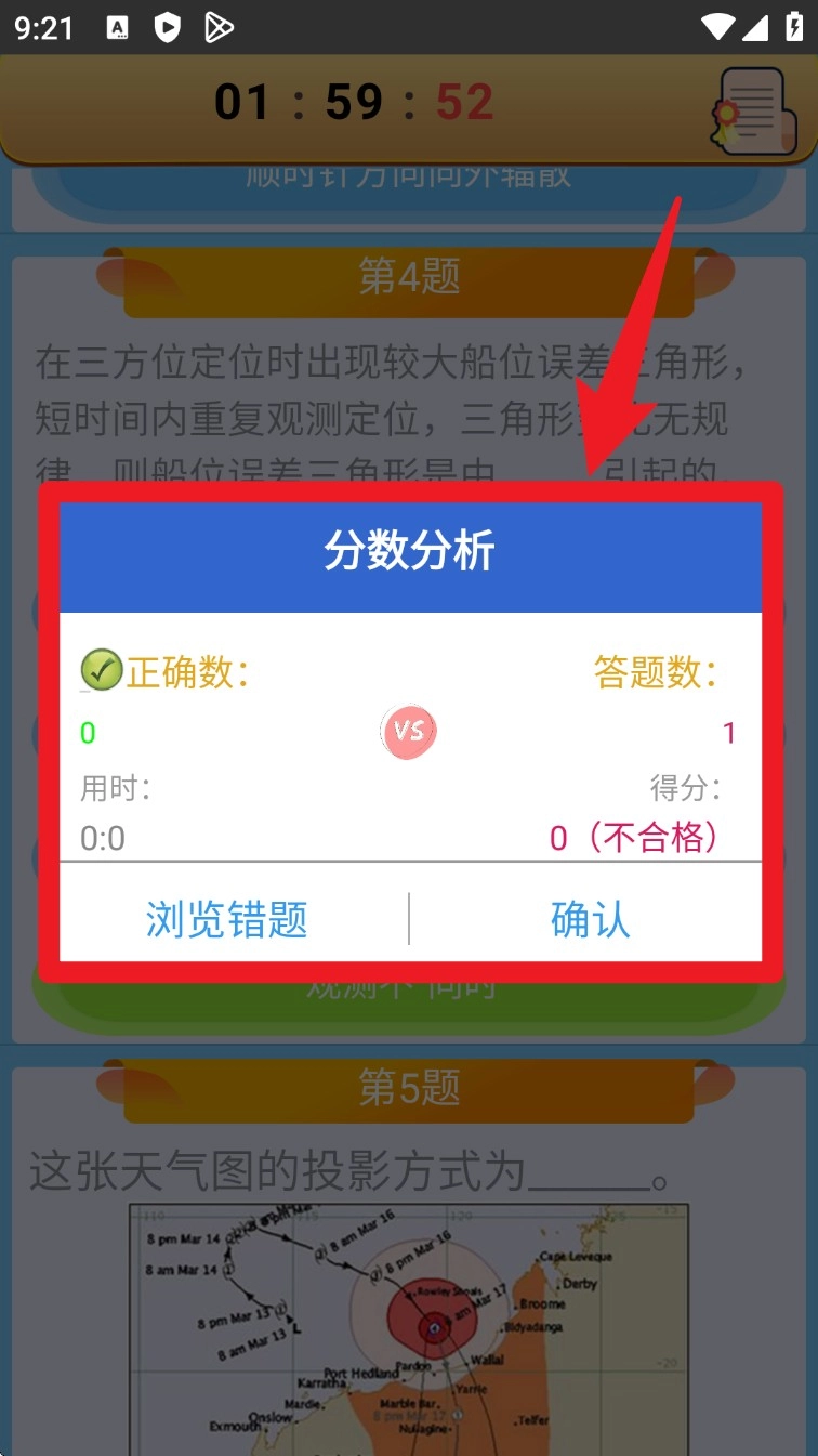 答题结束后会弹出分数分析框,显示答题数量、正确答题数量以及得分详情,同时支持跳转至错题页面进行查看。