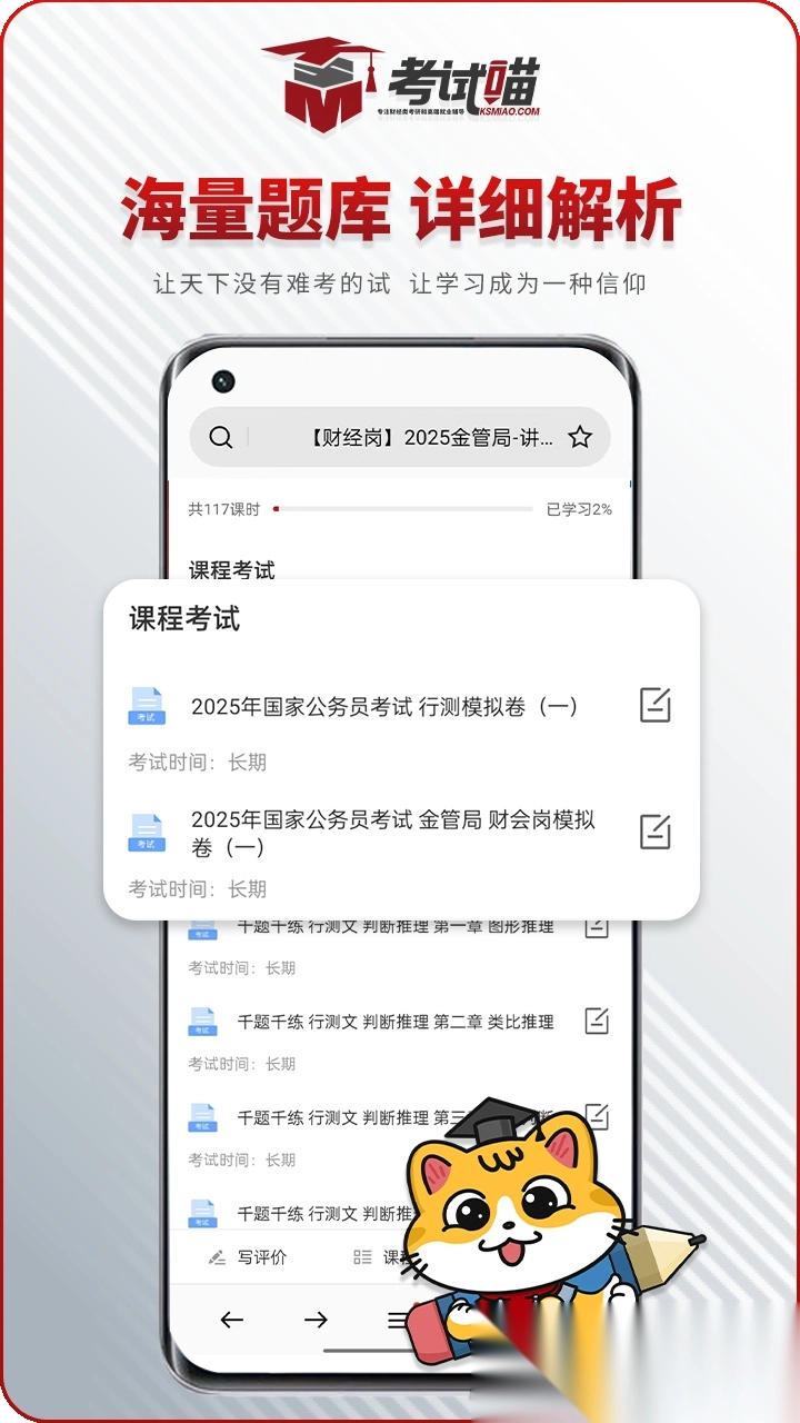 考试喵是贵州跃仕教育科技有限公司推出的一款免费学习备考工具,海量优质课程与丰富习题资源,还设有实时直播课堂及及时更新的考试资讯,能帮助用户高效开展系统复习与考前准备,有需求的用户可即刻体验。