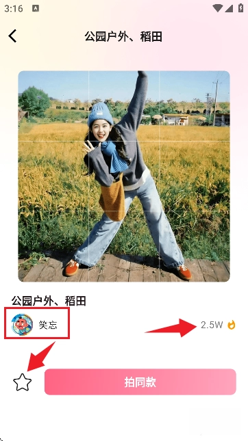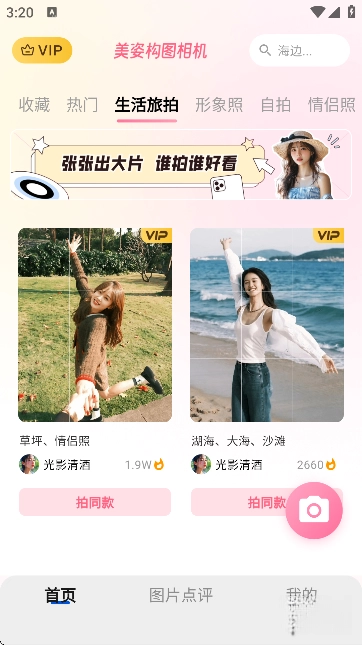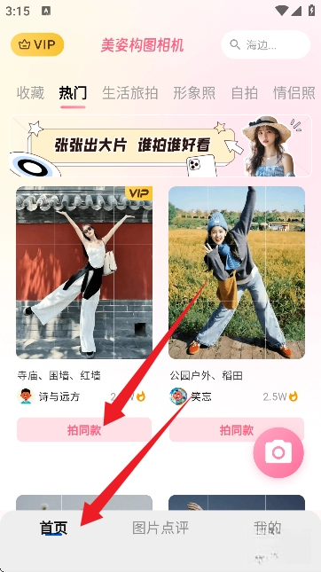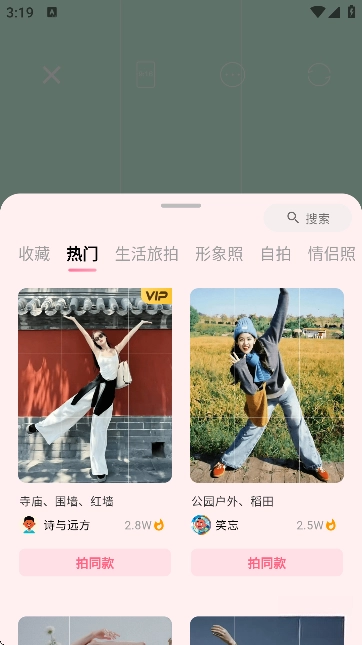 主界面呈现各类精致的拍照姿势模板,提供一键“拍同款”的便捷功能。