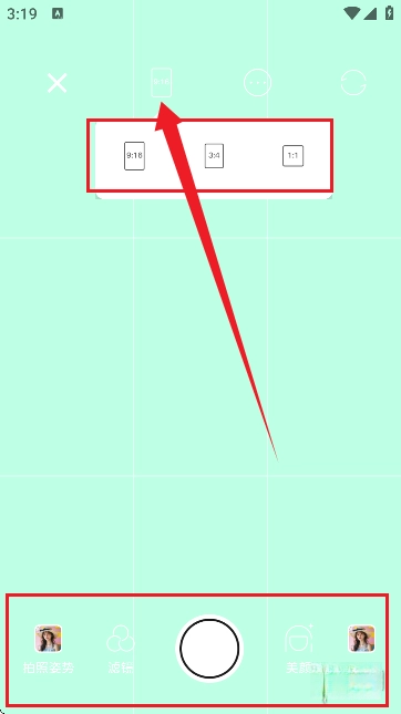 进入拍摄界面后,您可以自由切换不同拍照姿势、滤镜效果和美颜参数,还能调整拍摄画面的比例模式。