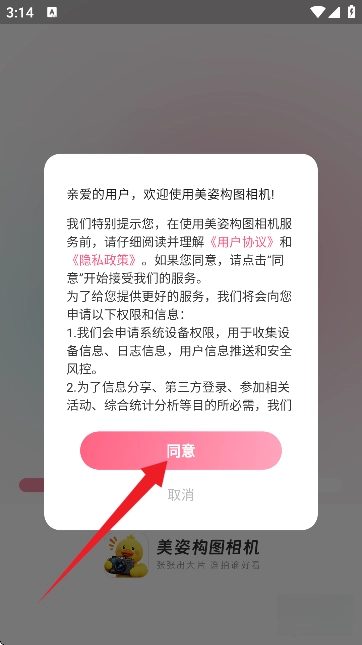 进入应用主界面后,请先仔细阅读并同意用户协议及隐私政策。