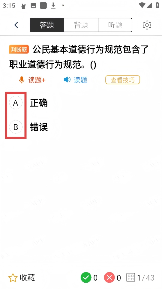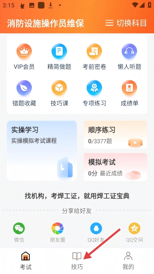 打开软件后,在首页点击页面底部的【技巧】选项,即可进入答题技巧页面。