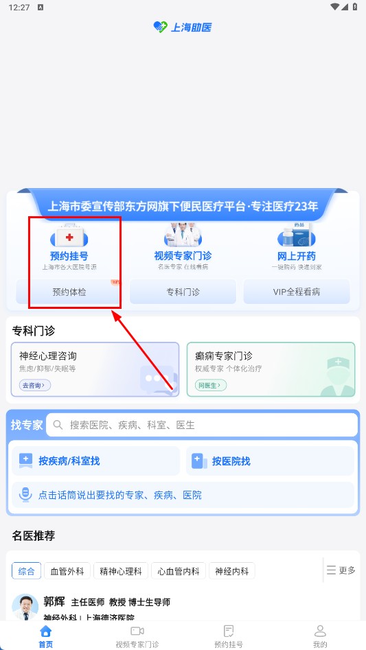 点击底部的【视频专家门诊】功能按钮,进入专家列表页面后,找到想咨询的专家,点击其旁边的【预约】功能按钮,即可完成专家咨询的预约。