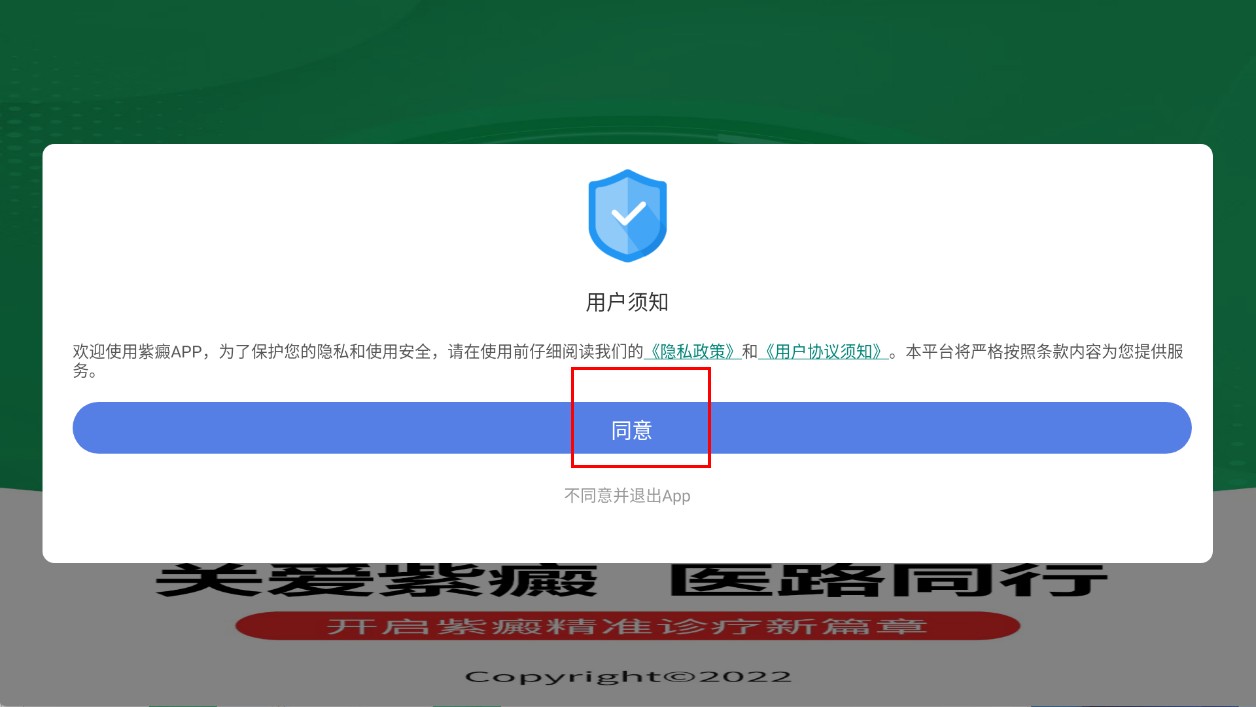 点击【同意】按钮,以确认并同意紫癜的《隐私政策》与《用户协议须知》。