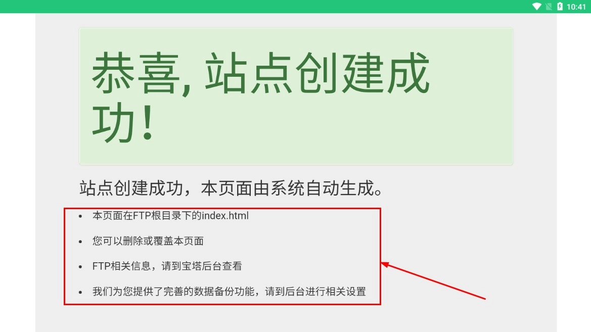 站点创建成功后,你可以查看FTP根目录下的index.html页面,这个页面可以进行删除或覆盖操作。至于FTP的相关信息以及数据备份功能,则需要进入后台进行查看和设置。