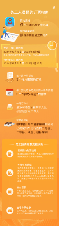 2025年12月15日至2025年2月7日期间,已经完成实名认证的务工人员可以在铁路12306手机客户端的“务工人员春运预约购票服务”专区,预订2025年12月31日至2025年2月23日之间的火车票。每个账户最多可以同时提交3个订单,每单可包含一个乘车日期下的5组“车次+席位”组合,总共能够为包括自己在内的9名乘客进行预约。务工人员可以提前至少17天(含当天)提出订票申请,最晚可预订至2025年2月23日的票务;需要在列车发车前17天的23点之前通过12306手机应用提交购票请求,并于发车前16天查看是否成功获得票额。如果申请被接受,则必须在得知结果当天的23点前完成支付;否则,未按时付款的订单将自动失效。