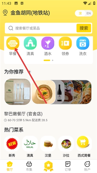 在餐厅页面,点击【早餐】分类,进入早餐商家列表页面,就能浏览提供早餐的商家。