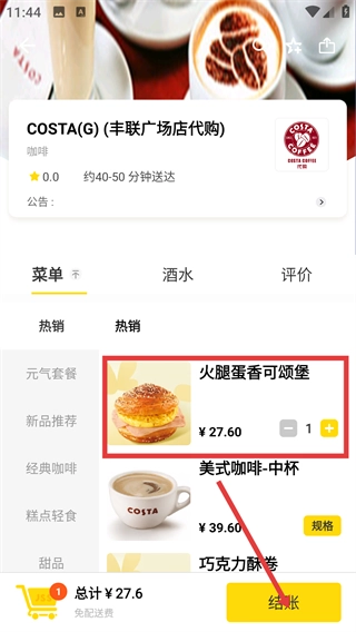 在早餐商家列表里,找到并点击你想查看的目标商家(比如【COSTA咖啡-丰联广场店代购】),进入该店铺的详情页面后,就能浏览餐品的相关信息了。