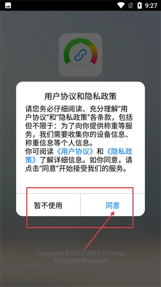 进入应用后会弹出《用户协议和隐私政策》的提示窗口,仔细阅读相关条款内容后,点击“同意”按钮,就能进入应用的主界面了。