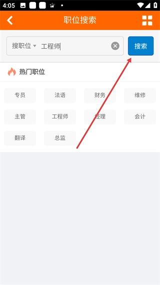 在职位搜索页面输入职位相关关键词,例如“工程师”,然后点击【搜索】按钮。