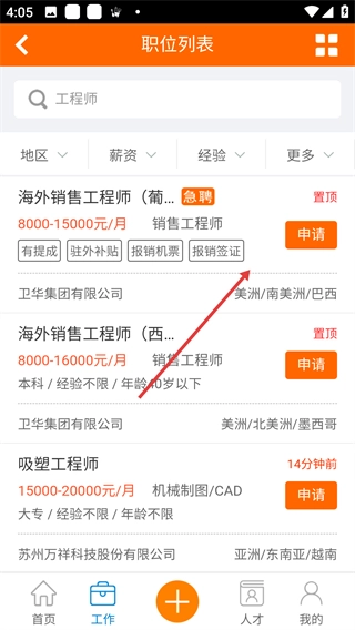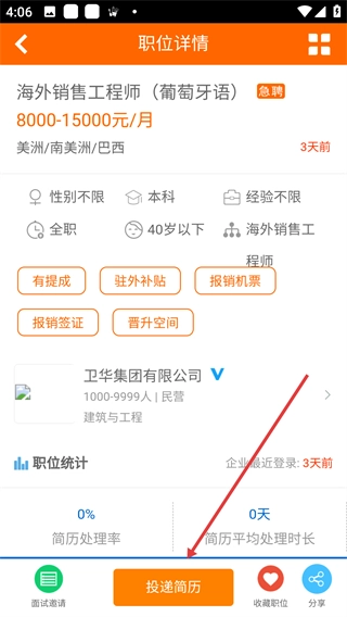 在职位列表页面挑选自己感兴趣的岗位,比如“海外销售工程师(葡萄牙语)”这一职位。