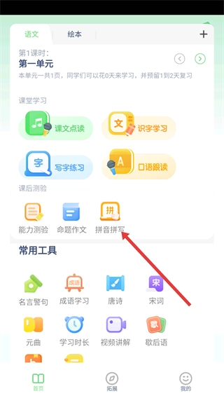 在语文学习界面找到并点击【拼音拼写】选项,即可进入拼音拼写的单元选择页面。