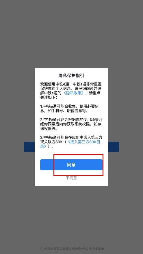 点击【同意-功能按钮】,以确认中铁e通的隐私保护指引。