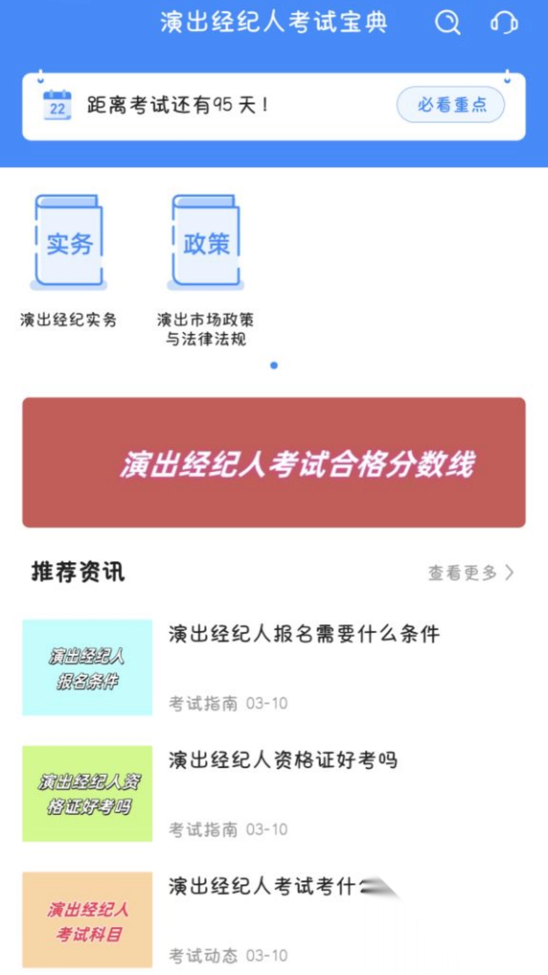 进入软件后,顶部会显示距离考试的剩余天数提示;中间部分提供演出实务教程、演出市场政策法规等学习资料,助力备考;底部则呈现最新的行业资讯。