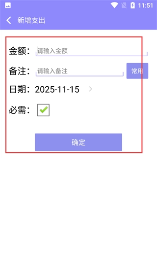 在新增支出的编辑页面,需填写【金额】【备注】等相关信息,同时选择对应的日期并标记该支出是否为必需项,以此完成支出信息的录入。