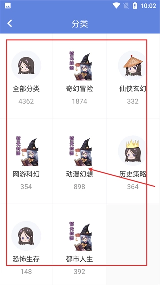 进入分类页面后,你可以挑选自己感兴趣的类型,像【动漫幻想】这类分类都能选,选好后就能进入对应的类别书籍列表页面了。
