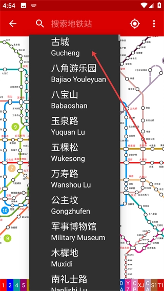在搜索页面选择目标地铁站,如“古城”。