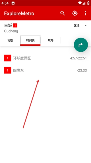 查询“古城”站的地铁运营时刻,例如1号线往环球度假区方向的运行时间是4:57至22:51,往四惠东方向的末班车时间为23:33,以此完成地铁时间的查询流程。