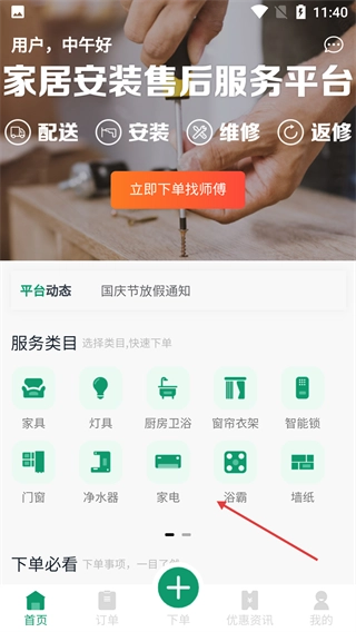注册登录后,在首页的服务类目区域可以选择家电等服务类型,点击【立即下单找师傅】按钮就能进行服务下单操作。