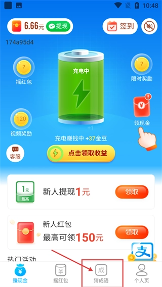 在赚钱类首页,点击“猜成语”选项,进入猜成语答题页面,参与答题可获取金豆奖励。